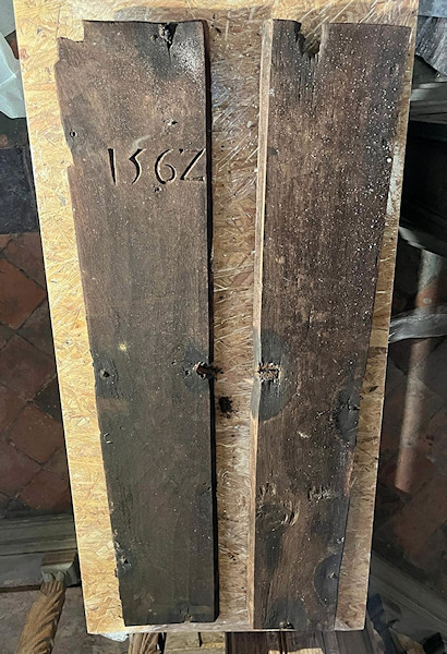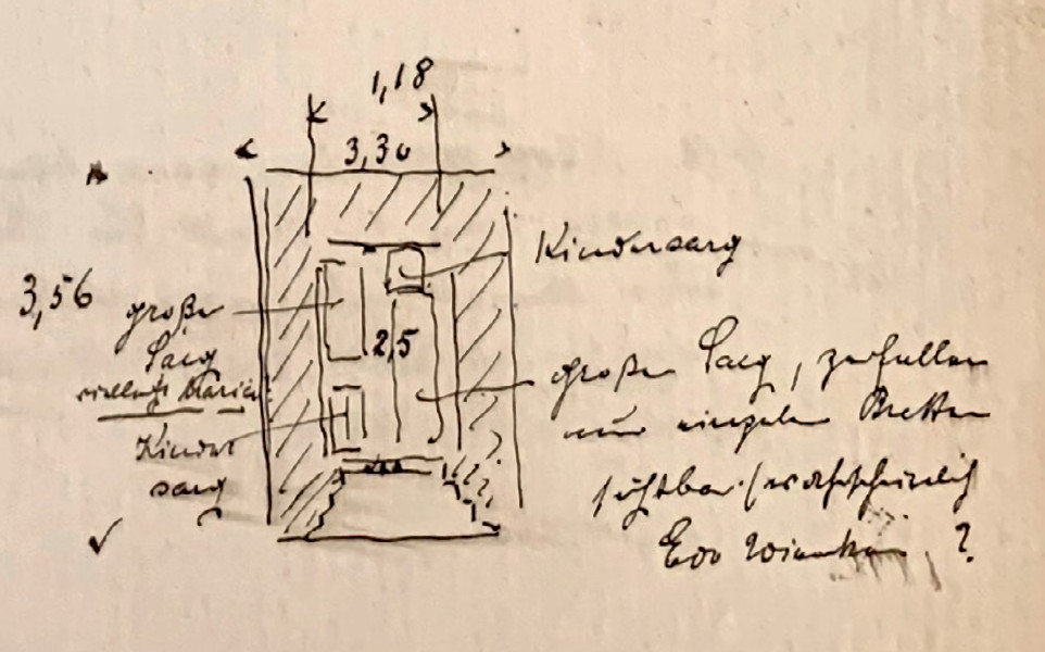 - Wenn der große Sarg eindeutig später hergestellt worden ist, -und dies könnte 1575, also 13 Jahre nach der Herstellung der kleinen Beinkisten, die mit 1562 bezeichnet sind, geschehen sein-, dann kann dieser nur für die Beisetzung Marias getischlert worden sein.