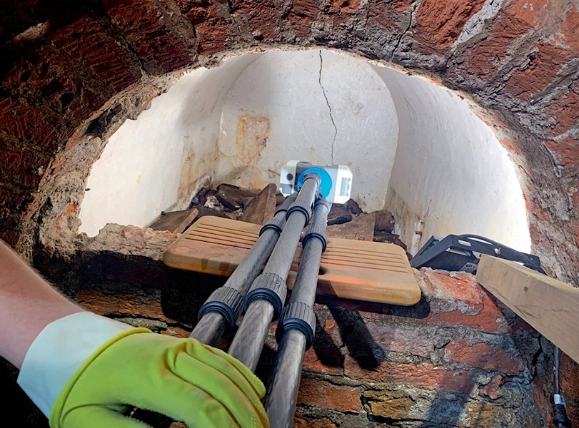 Die Untersuchung mit dem 3D-Scanner bietet eine wichtige Grundlage für die weiteren Maßnahmen. Man erkennt deutlich einen durchgehenden Riss im Gewölbe der Gruft.