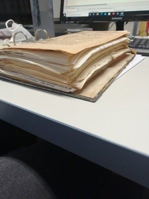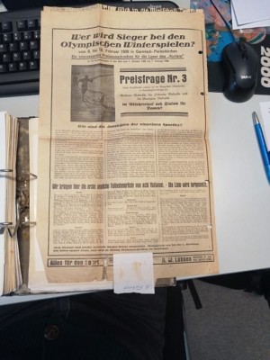 Die meiste Zeit des Praktikums war ich in den Aufbau der Duckomenta eingespannt. Nichtsdestotrotz habe ich auch Einblicke in die Bibliothek und in das Inventarisieren von Glasdias gewinnen können.In der Bibliothek erwartete mich geballte Regionalgeschichte, die sich in Zeitungsartikeln und Briefen vom frühen 20. Jahrhundert bis 2011 entfaltete. Meine Aufgabe war die Entnahme der Rahmeninformationen und die Einspeisung in eine Tabelle, sodass die noch folgende Digitalisierung erleichtert wird. Man munkelt, dass es die ideale Aufgabe für Praktikant:innen sei. Spannend waren ganze Zeitungsseiten die, neben dem im Vordergrund stehenden Artikel, auch über andere interessante Themen berichten. So fand ich beispielsweise eine großflächige Informationsanzeige für die Olympischen Winterspiele 1936 in Garmisch-Patenkirchen. Neben Einblicken in die Regionalgeschichte, konnte ich aus verschiedenen Perspektiven auf die Alltagsgeschichte blicken. Dadurch, dass neben den Zeitungsartikeln auch Briefe enthalten waren, lernte ich die schriftsprachlichen Konventionen verschiedener Jahrzehnte kennen. Jedoch muss ich gestehen, dass ich die handschriftlichen Briefe und Urkunden aus den 1890er Jahren nur schwer entziffern konnte.