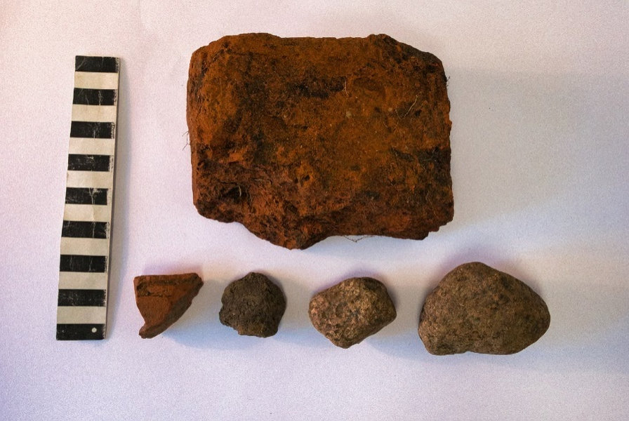 Und da haben wir nun die Hinweise, wie vor gut 200 Jahren der Hügel entstanden sein könnte. Eben mit diesem Material der abgerissenen Unterburg. Upcycling nennt man dies wohl heutzutage, ein sehr nachhaltiger Gedanke, schon damals. Aber nicht nur in der Profilwand konnte man die Ziegelreste entdecken. Auch im ausgeschaufelten Bodenmaterial, dem Abraum, kamen nach und nach Ziegelfragmente zum Vorschein. Zudem massive Gesteinsbrocken (in erster Linie Granit), die es sicherlich nicht auf natürlichem Wege hierhergeschafft haben. Doch trotz dieser erfreulichen Erkenntnis musste die Bohrstange dennoch gezogen werden. Im Dickicht der rapide wachsenden, vor allem stechenden Sträucher am ungünstigen Hang musste nun tiefer gegraben werden. Das größer werdende Loch glich einem kleinen Sondageschnitt.