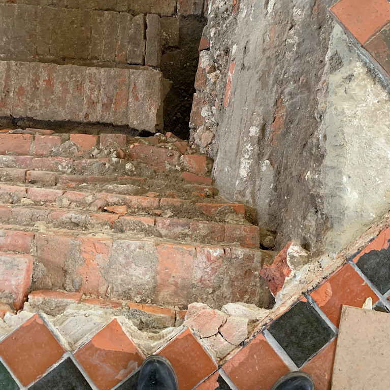 Es bleibt spannend: Im Rahmen der weiteren Freilegung der Treppen zur Gruft unter dem Edo Wiemken-Grabmal aus der Zeit um 1560 wurden im März 2026 auch Fundamente einer Mauer, die hinter dem ursprünglichen Altar der barocken Stadtkirche errichtet wurde, entdeckt.