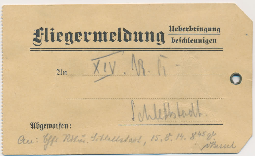Die Männer aus dem Elsass unterstanden ab Oktober 1914 der Etappen-Inspektion 9, spätestens ab Februar 1915 der Etappen-Inspektion Woyrsch, die zur improvisierten, nach ihrem Befehlshaber Remus von Woyrsch benannte Armeeabteilung Woyrsch gehörte. Diese hielt sich im November 1914 in Schlesien auf. Hinrichs kann also derjenige gewesen sein, der die Objekte im Schützengraben aufgelesen hat. Im August 1914 war er, wie auch das Bataillon, noch im Elsass, wie seine Unterschrift auf dem Umschlag einer Fliegermeldung belegt – die ebenfalls ihren Weg ins Schlossmuseum gefunden hat.