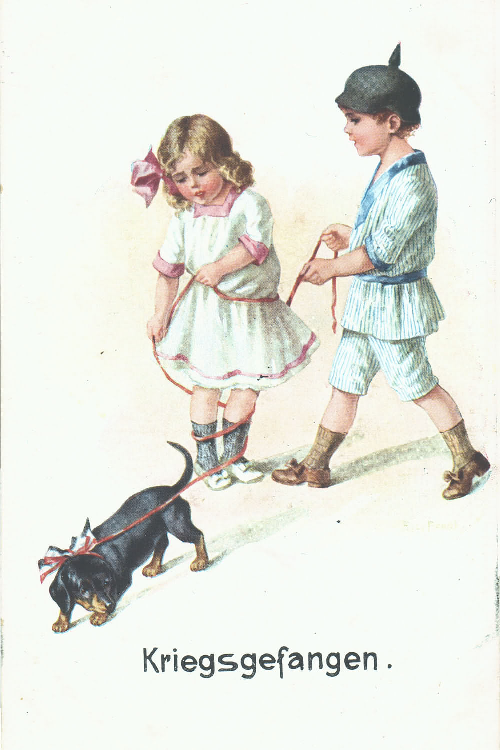 Darstellungen von Kindern mit Pickelhauben, hier mit feldgrauem Überzug, sollten die Wehrhaftigkeit der gesamten Nation symbolisieren. Im vorliegenden Fall ist ein positiver Bezug auf sexuelle Gewalt im Kriege nicht zu übersehen, da der „Soldat“ gemeinsam mit seinem Schwarz-Weiß-Rot tragenden Hund ein Mädchen „kriegsgefangen“ nimmt. Sie ist von der Hundeleine gefesselt, wodurch sie am (Weg-)Gehen gehindert wird, während der Junge sich ihr forsch nähert – legitimiert durch die Pickelhaube.