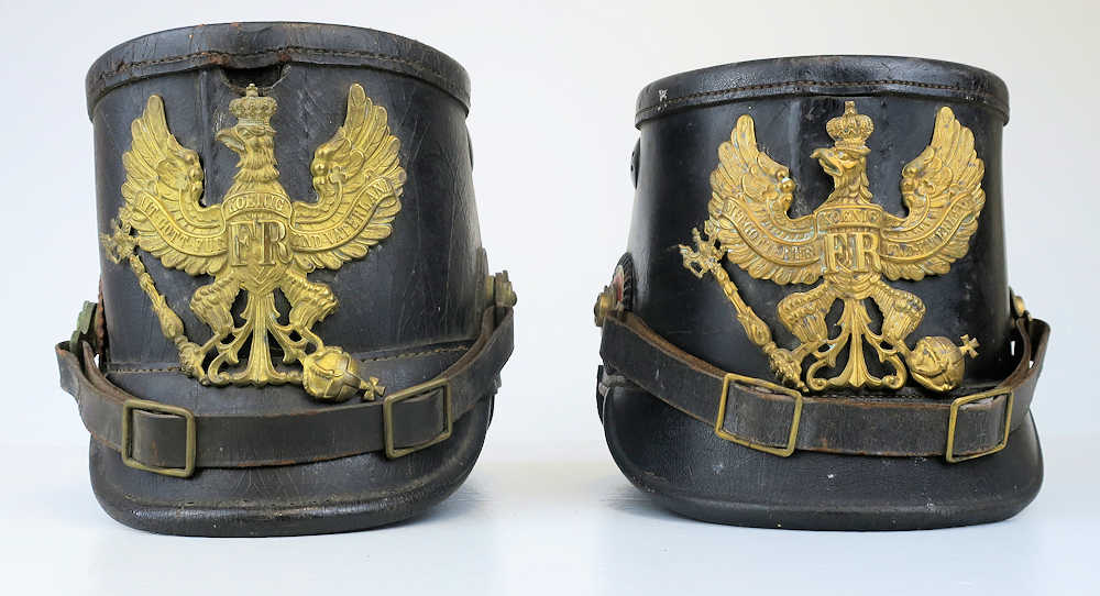 Es gab zwei Arten der Gestaltung der Initialen auf den Jägertschakos. Diejenige auf den in der Sammlung vorhandenen Exemplaren zeigt die unverschnörkelten Initialen „F.R.“. Sie wurden vom 3., 4., 7., 8., 9. und 11. Bataillon getragen, was mit dem Kammerstempel des 3. Bataillons in den Objekten korrespondiert. Die bei uns nicht vorhandene, verschnörkelte Version „F.W.R.“ fand sich auf den Tschakos des 1., 2., 5. und 6. Bataillons.