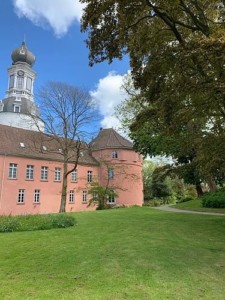 Man sieht es richtig vor sich: nach einer kleinen Lesestunde öffnet der Großherzog die Tür und steigt die wenigen Stufen hinab in den Garten seines Schlosses zu Jever. Hier erstreckt sich seit 1830 eine Parklandschaft im englischen Stil, die Elemente der alten Burganlage aufnimmt, aber auch durch die Modellierung der Flächen und der Art der Anpflanzungen die Natur im Kleinen abbilden will. Die Gartentür besitzt Glasfenster, auch im oberen Rundbogen, so dass das Gartenzimmer dahinter lichtdurchflutet ist und auch durch die Fenster, die ähnlich wie die Tür gestaltet sind, träumerische Blicke in den Schlosspark ermöglicht.