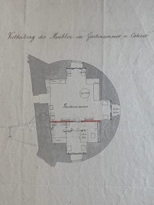 Ein Einrichtungsplan aus dieser Zeit um 1840 sah für diesen Raum noch einen Bücherschrank, einen Eckdiwan, acht vergoldete und lackierte Rohrstühle, einen runden Tisch zum Ausziehen mit Einlagebrettern, ein Sideboard, zweifach Fenstergardinen, Spuckkasten, Torfkasten, Feuerzange und Schaufel vor. Das Gartenzimmer diente zeitweise auch als Lese- und Bibliotheksraum, hier konnte man mit Blick auf ein Blütenmeer frühstücken.