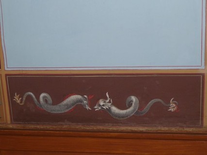 Bei den umfangreichen Erneuerungen um 1840 wurden sämtliche Räume der Belle Etage zeitgemäß ausgestaltet. Die kunstvolle Papiertapete aus dieser Zeit orientiert sich an dem antiken Stil, der durch farbig bebilderte Publikationen der Wandbemalungen pompejanischer Villen große Verbreitung fand.